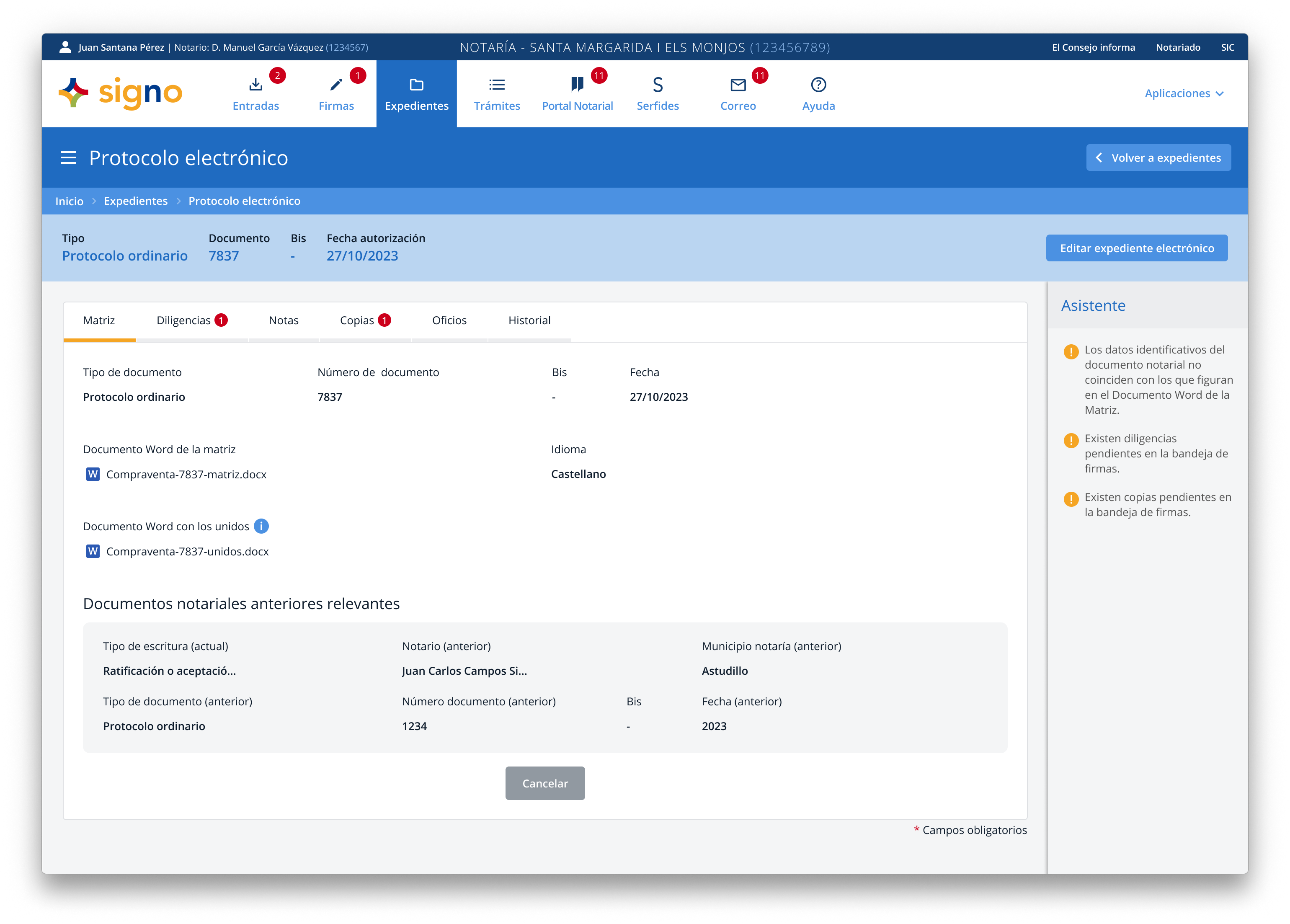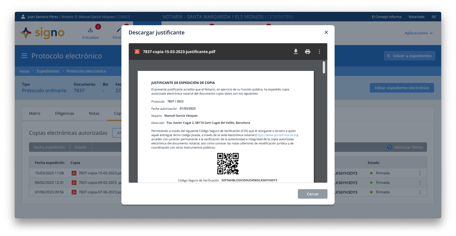 También señala que “este proceso ha significado un aumento significativo de la carga de trabajo del personal de la notaría, por lo que sería deseable analizar la posibilidad de simplificar su elaboración”. García añade que “las sesiones informativas preparadas por Ancert fueron de gran utilidad, al igual que las consultas técnicas realizadas al personal del centro y a su empresa informática”, aunque “no hubo oportunidad de probarlas hasta el día de puesta en marcha, lo que generó cierta incertidumbre”. En cuanto a la carga de trabajo señala que “el personal encargado de las tareas burocráticas y de las copias ha experimentado un considerable aumento de la carga de trabajo. El trabajo del personal que elabora las matrices ha permanecido prácticamente igual”. Como mejora, ve deseable “que se vayan solucionando problemas técnicos con el uso de la multifirma, la validación de los documentos de identidad en el alta del PNC y la obtención de certificados para el otorgamiento electrónico. Asimismo, sería beneficioso desarrollar una aplicación para la remisión de copias específicas para gestorías, mejorar la ordenación técnica del protocolo electrónico para simplificar su elaboración y automatizar el alta de ciudadanos en el Portal Notarial del Ciudadano”.